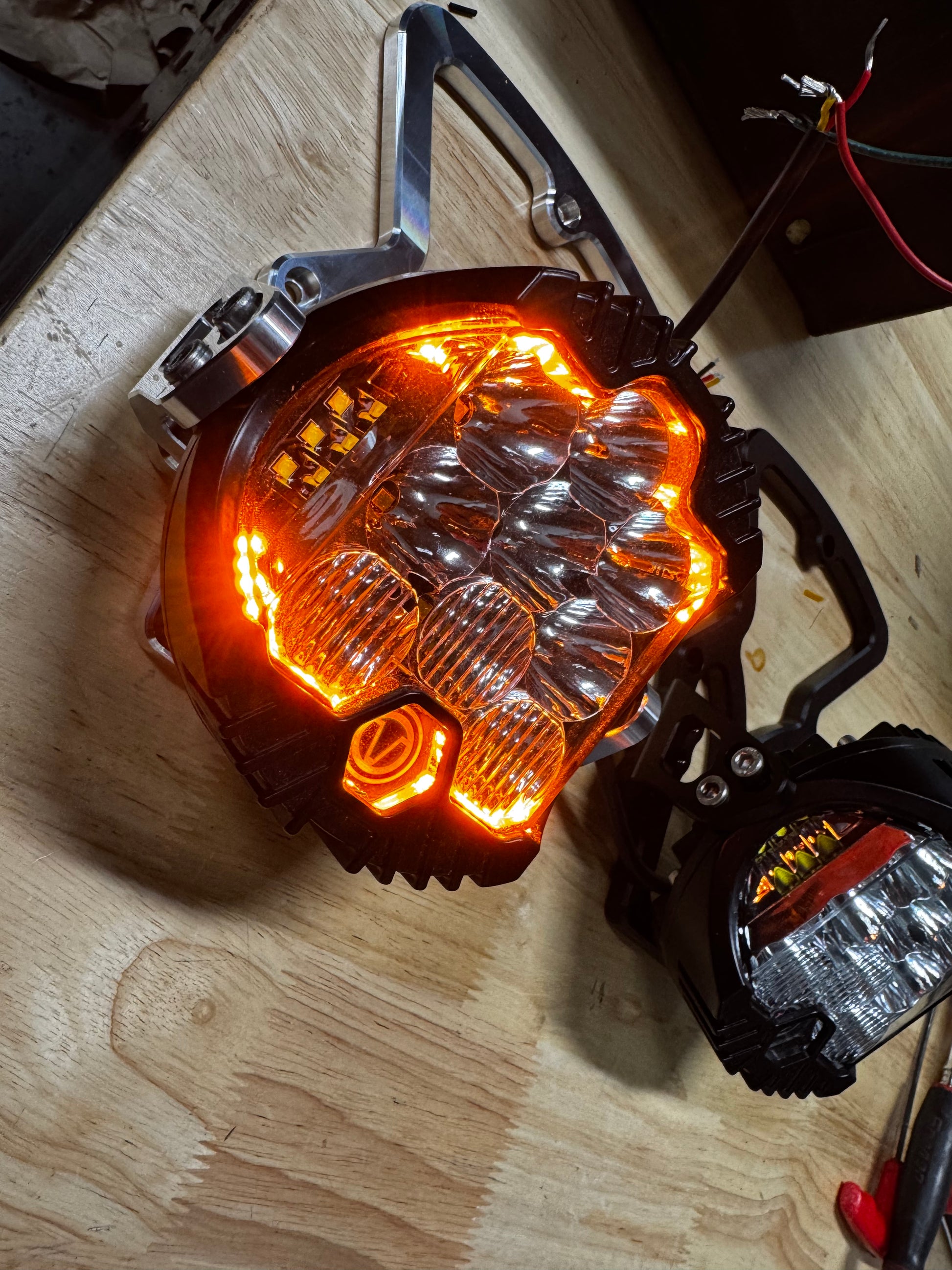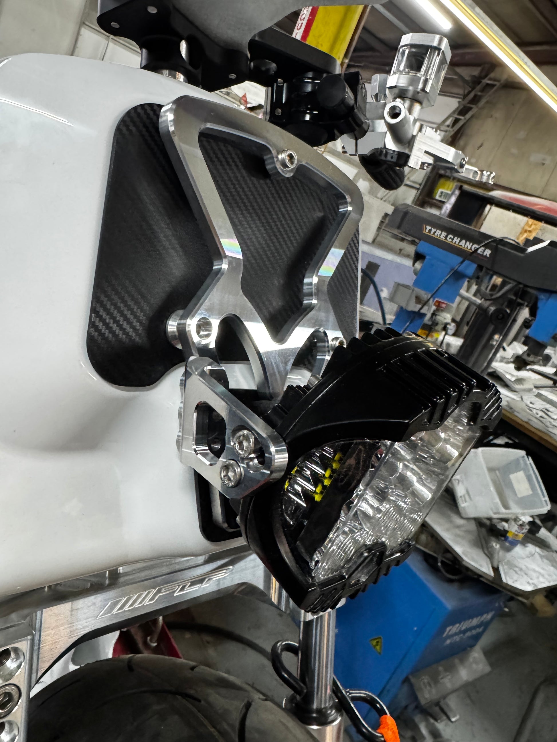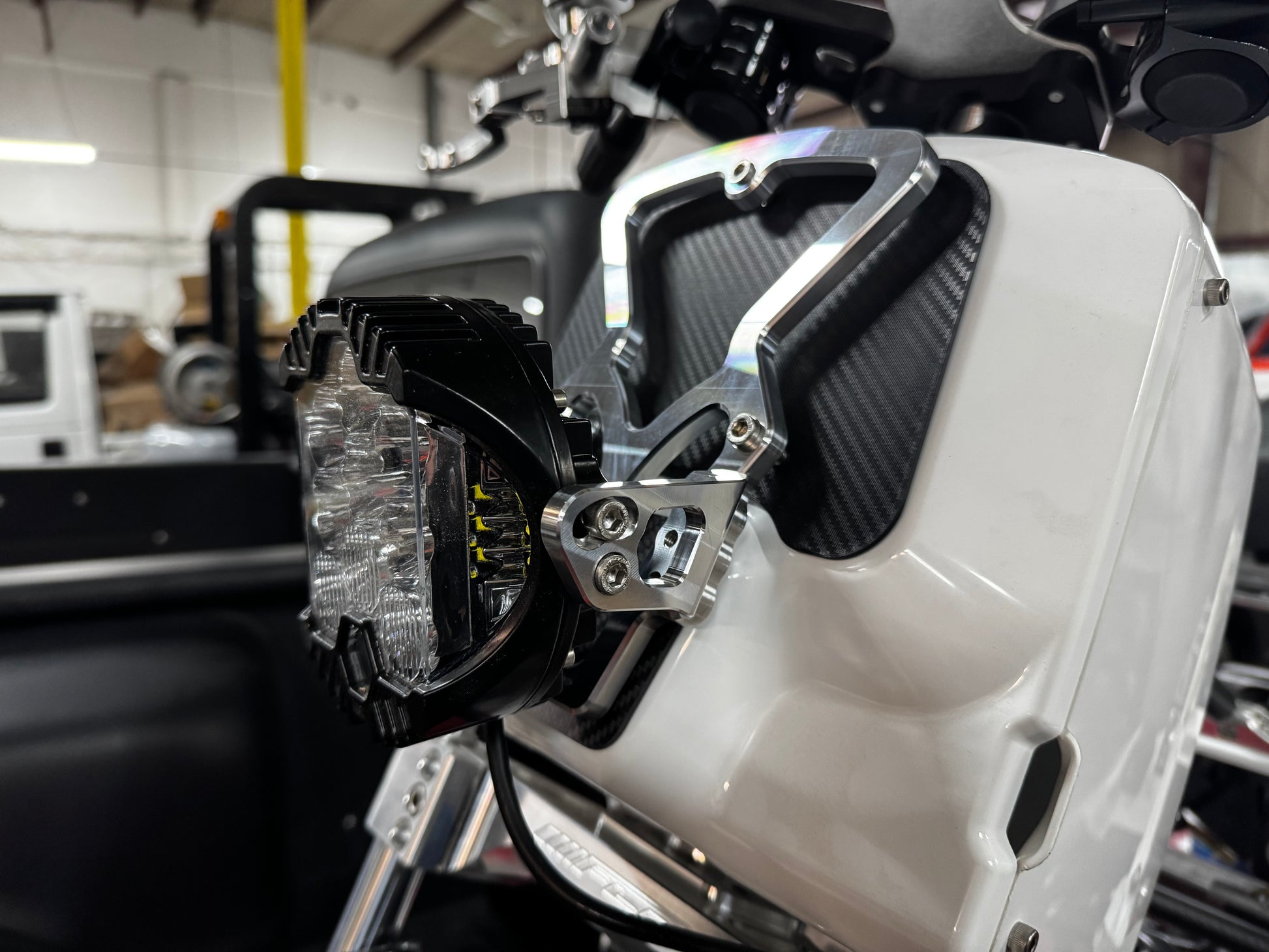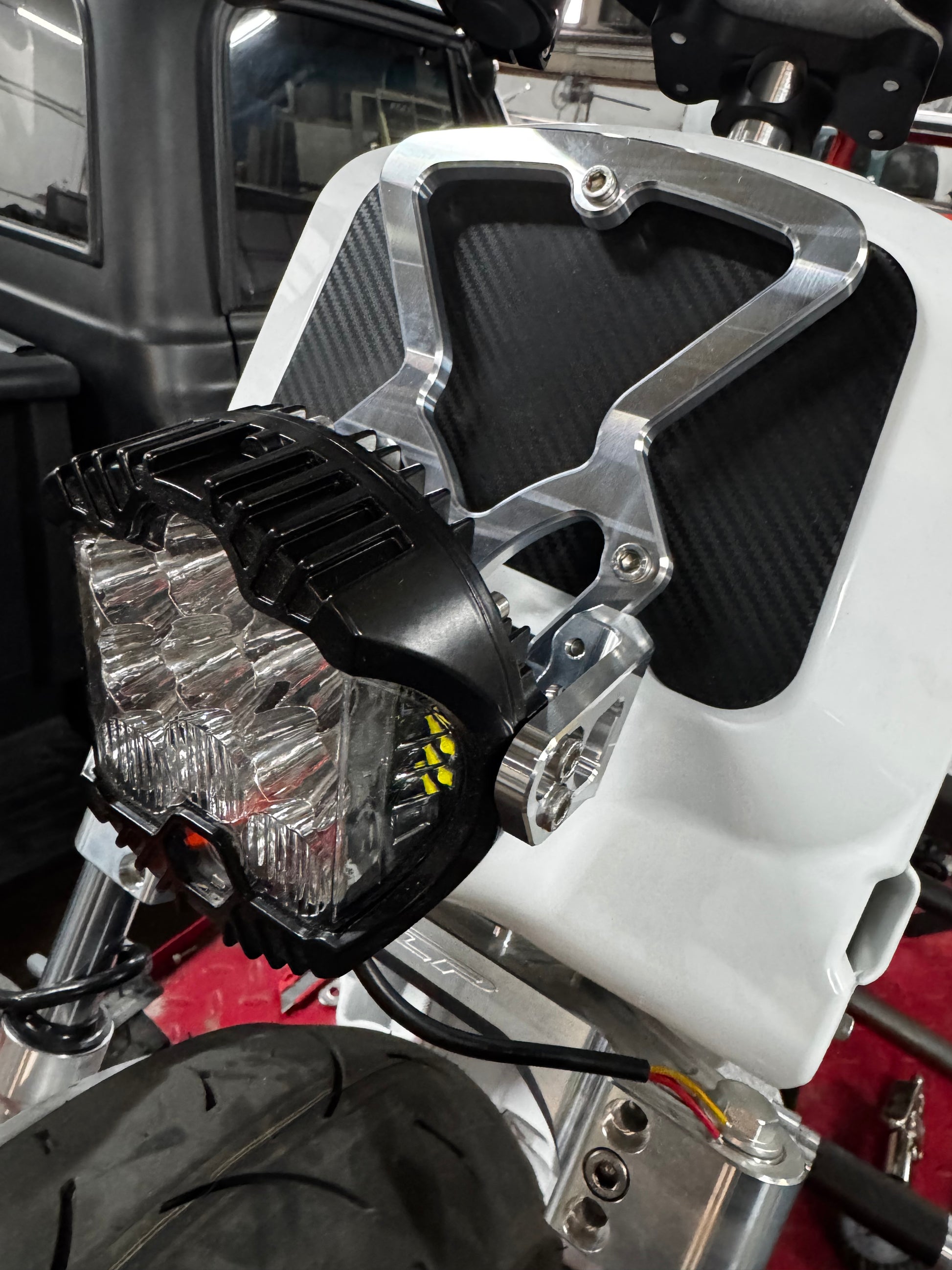 The FLP / GHOST LIGHT is a full billet lighting system for the Honda Ruckus. Built around a high-output 5" off-road LED bar with amber driving light, spot + flood forward lighting, and side-shooter LEDs, this setup delivers 180° of visibility with a premium CNC-machined billet bracket system.